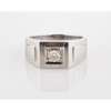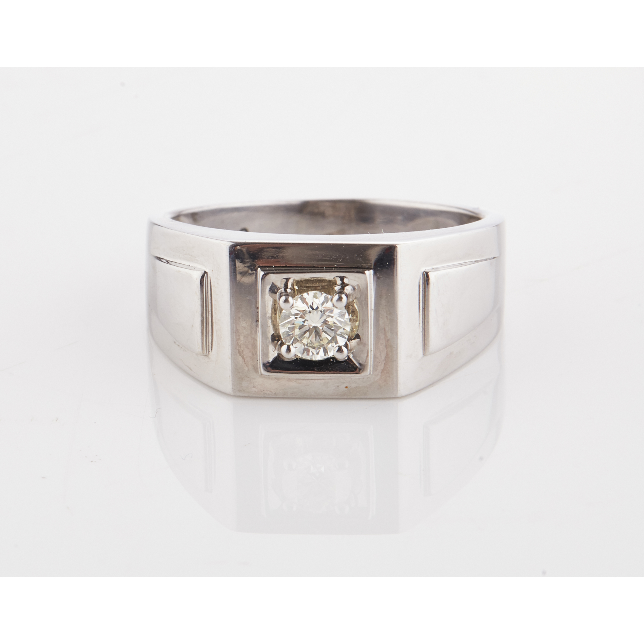 claw set with a round brilliant cut diamond, in a squared mount to plain tapering shoulders, stamped 18K