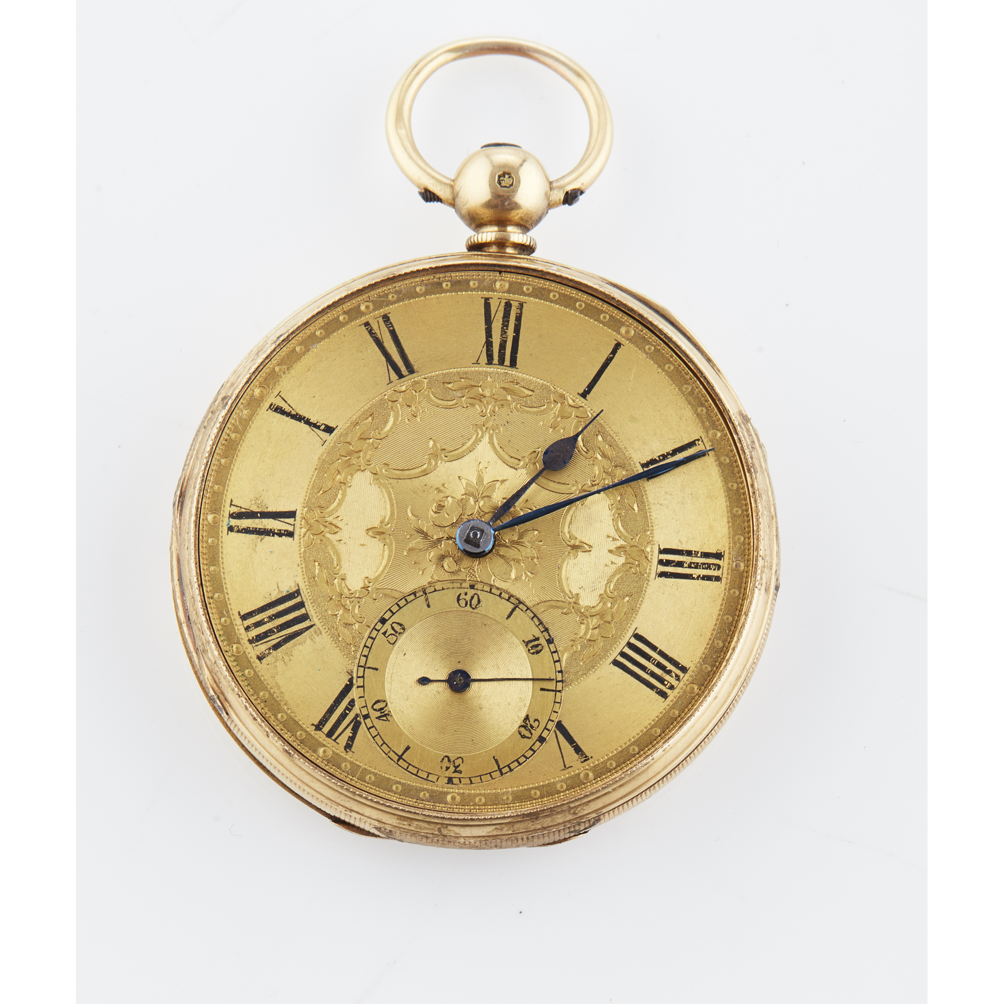 open faced, key wind, rear hinged cover engraved floral sprays, gilt dial, Roman numerals, English lever movement inscribed J. R. and W Laing 53 & 55 Brunswick Street, Glasgow