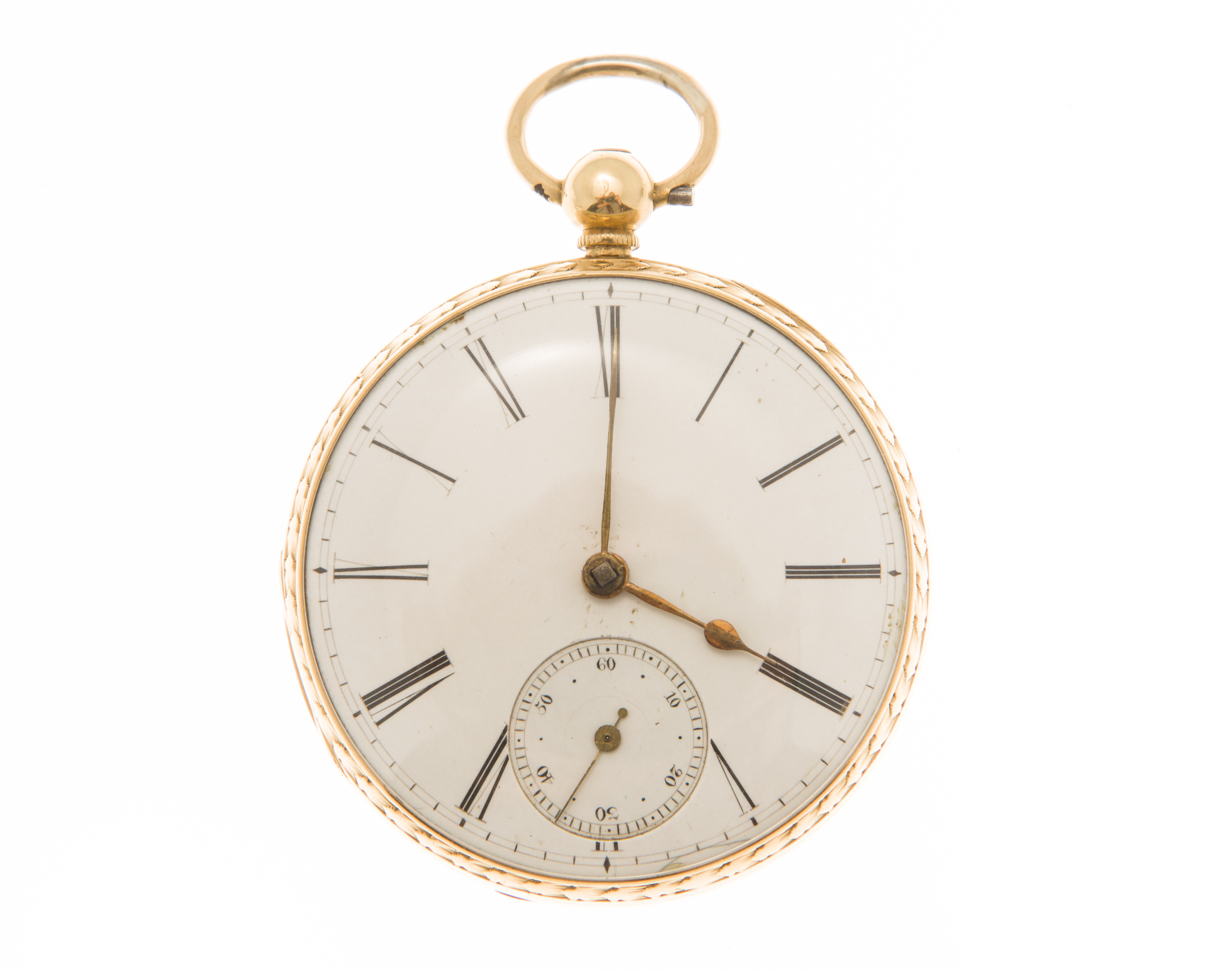open faced, key wind, lever movement, unsigned, white dial, subsidiary seconds dial, engraved borders to case