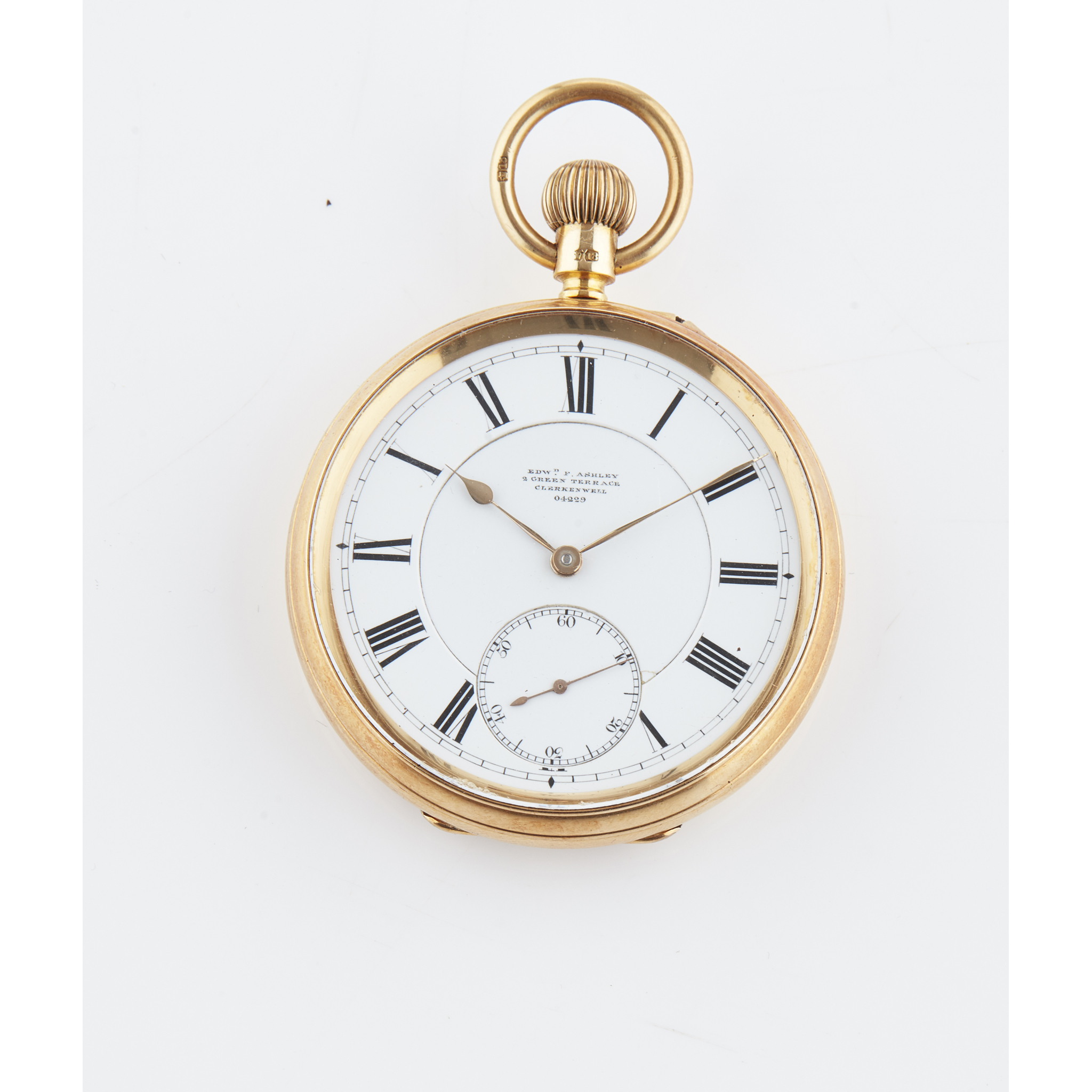 the dial with Roman numerals, subsidiary seconds dial, inscribed Edward Ashley, Clerkenwell London, numbered 4229, engraved to rear, three quarter plate lever movement also inscribed and numbered, as is the fitted case
