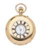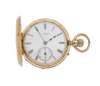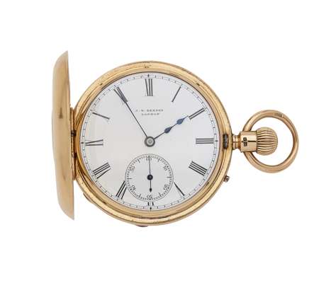 demi hunter case with blue enamel Roman indicators, white enamel dial, subsidiary seconds dial, keyless wind movement, plain heavy gold case, in fitted leather case