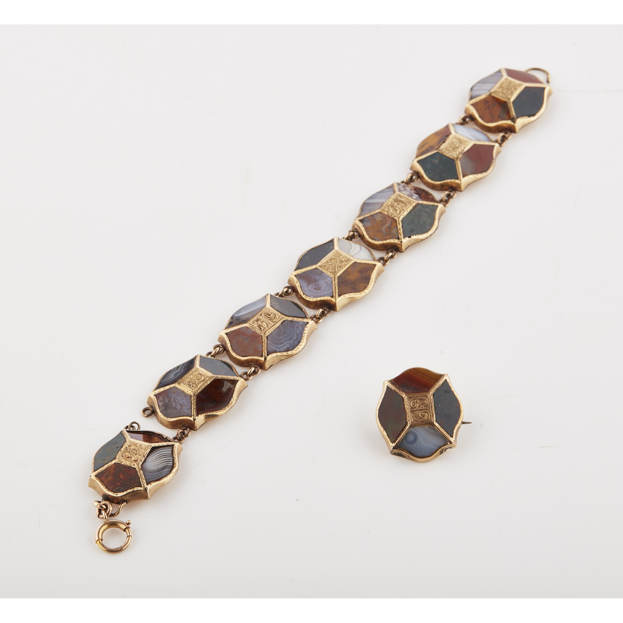 composed of shaped oval links modelled in unmarked yellow metal, each link set with various bloodstone, banded and moss agates; with a associated brooch with glazed panel to reverse (2)