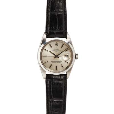 Oyster Perpetual Date, silvered dial, baton numerals, sweep second hand, screw down winder, screw off back