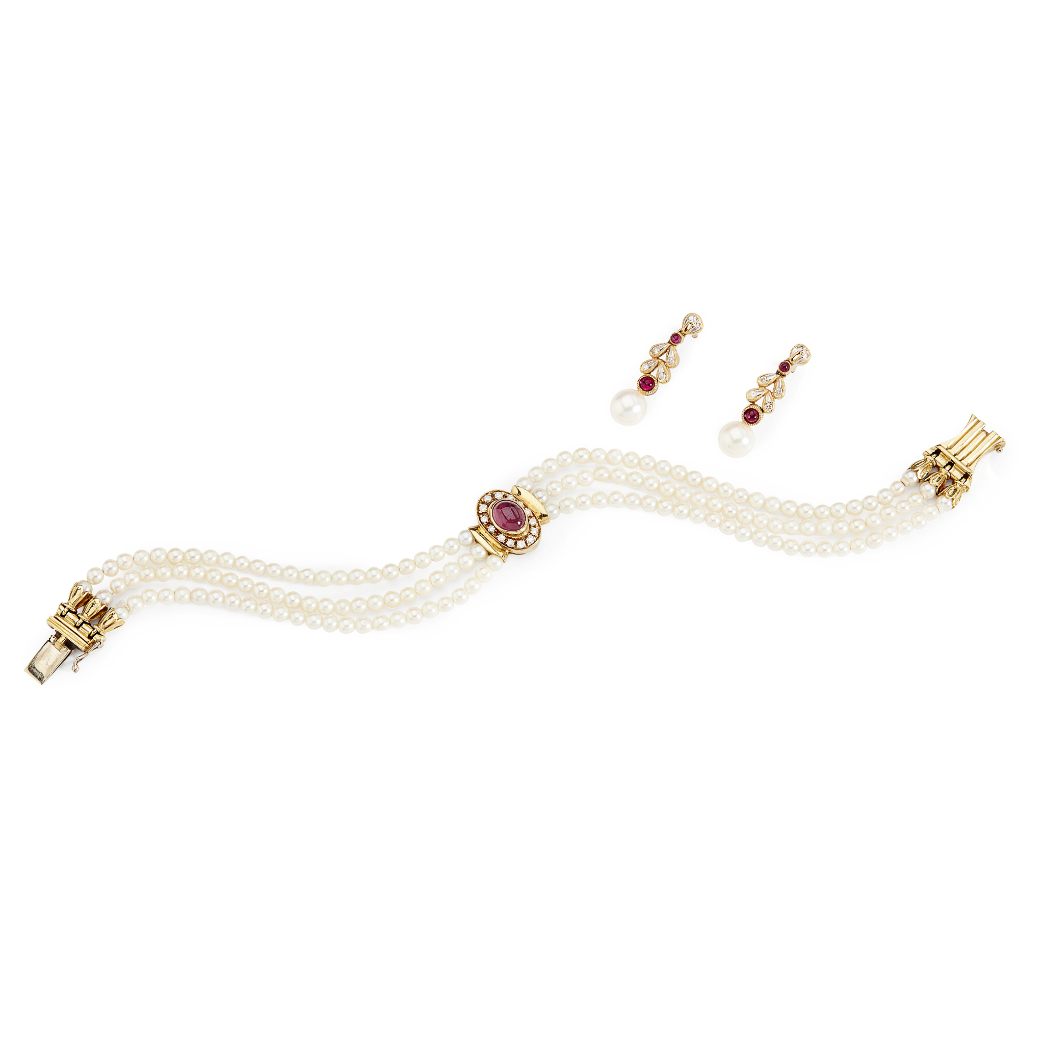 the bracelet set with a cabochon ruby in a single border of small round cut diamonds set in yellow metal, to three strands of uniform cultured pearls; together with a pair of associated diamond ruby and pearl set pendant earrings (2)