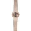 the oval silvered dial with Roman and baton numerals, in a single border of small round cut diamonds, to a plain white metal woven link bracelet with fold over clasp, stamped 750