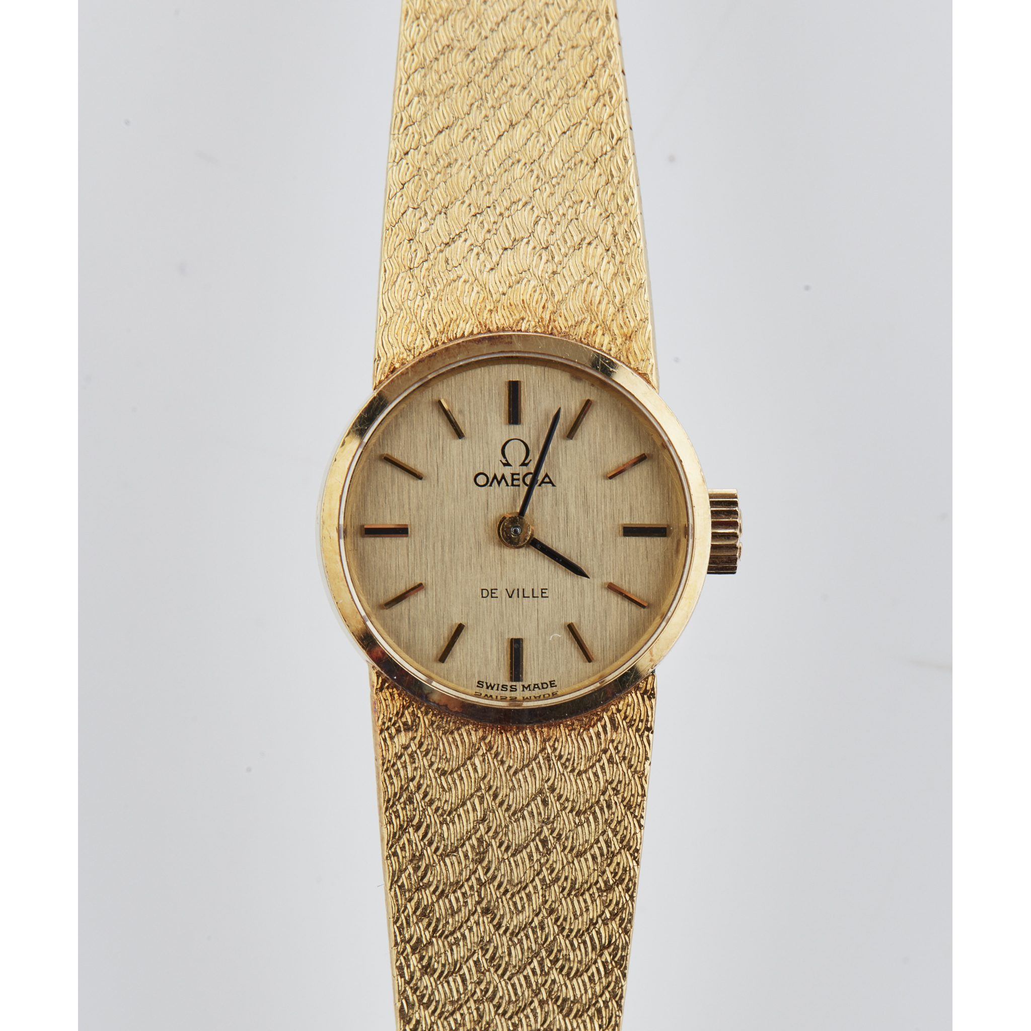 the circular champagne dial with baton numerals, to an integral woven link bracelet, foldover clasp stamped 750
