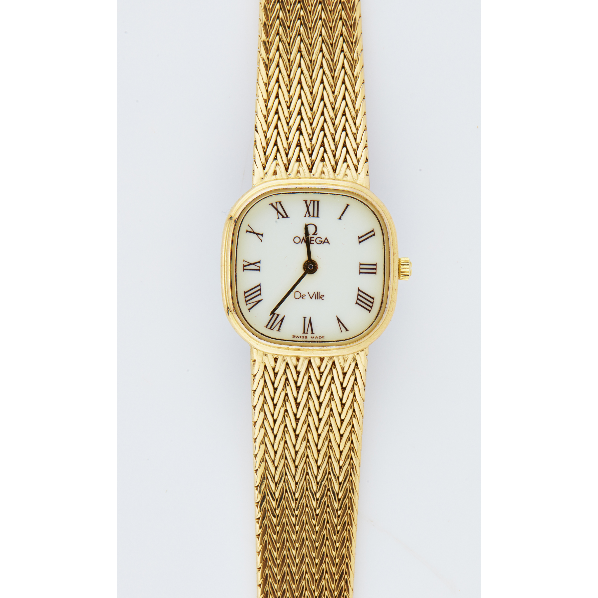 Quartz movement gilt case, white dial, integral bracelet and cased