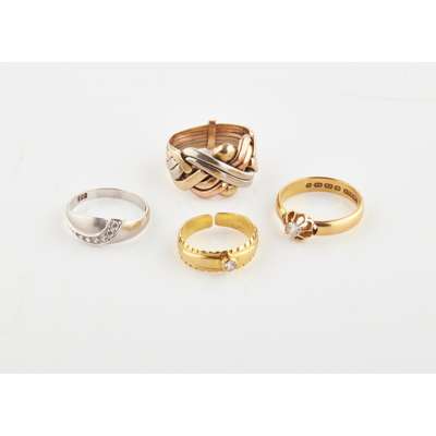 the yellow, white and rose gold interwoven bands with locking slide; together with a white metal and diamond set ring; a 22ct single stone diamond ring; a yellow metal and paste set ring (4)