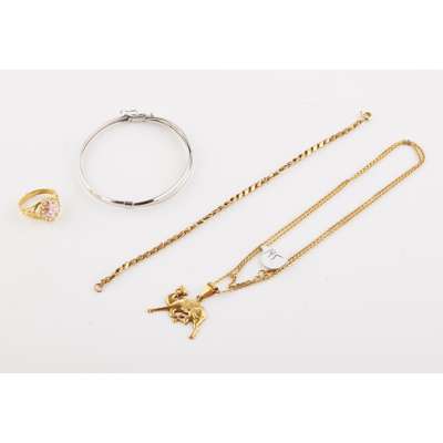 of plain design, stamped Italy 375; together with a yellow metal s-link bracelet; a yellow metal and pink paste set ring; a yellow metal camel pendant and chain (4)