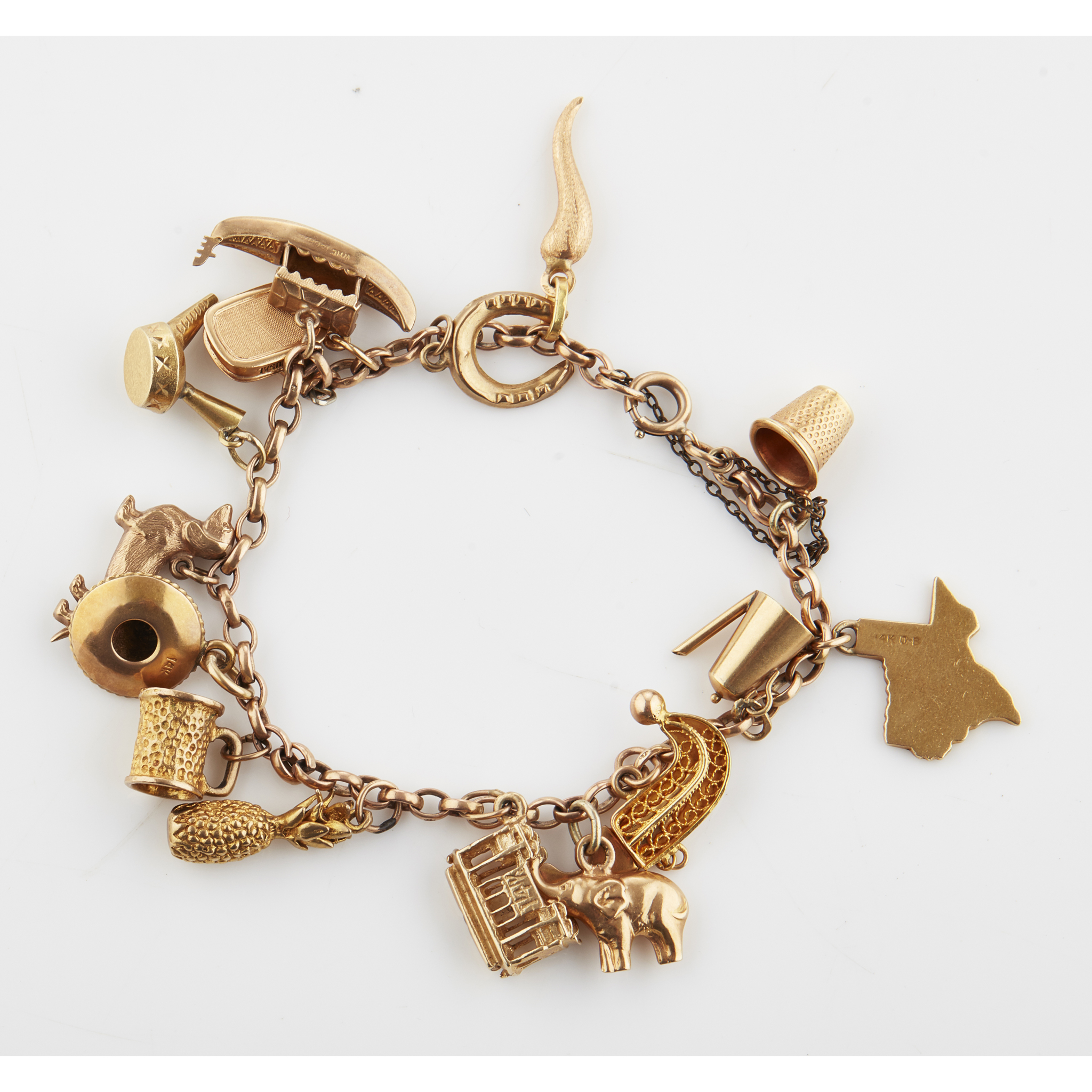 the yellow metal belcher chain suspending various 9ct and 18ct gold charms, such as a horseshoe, boat, dachshund etc