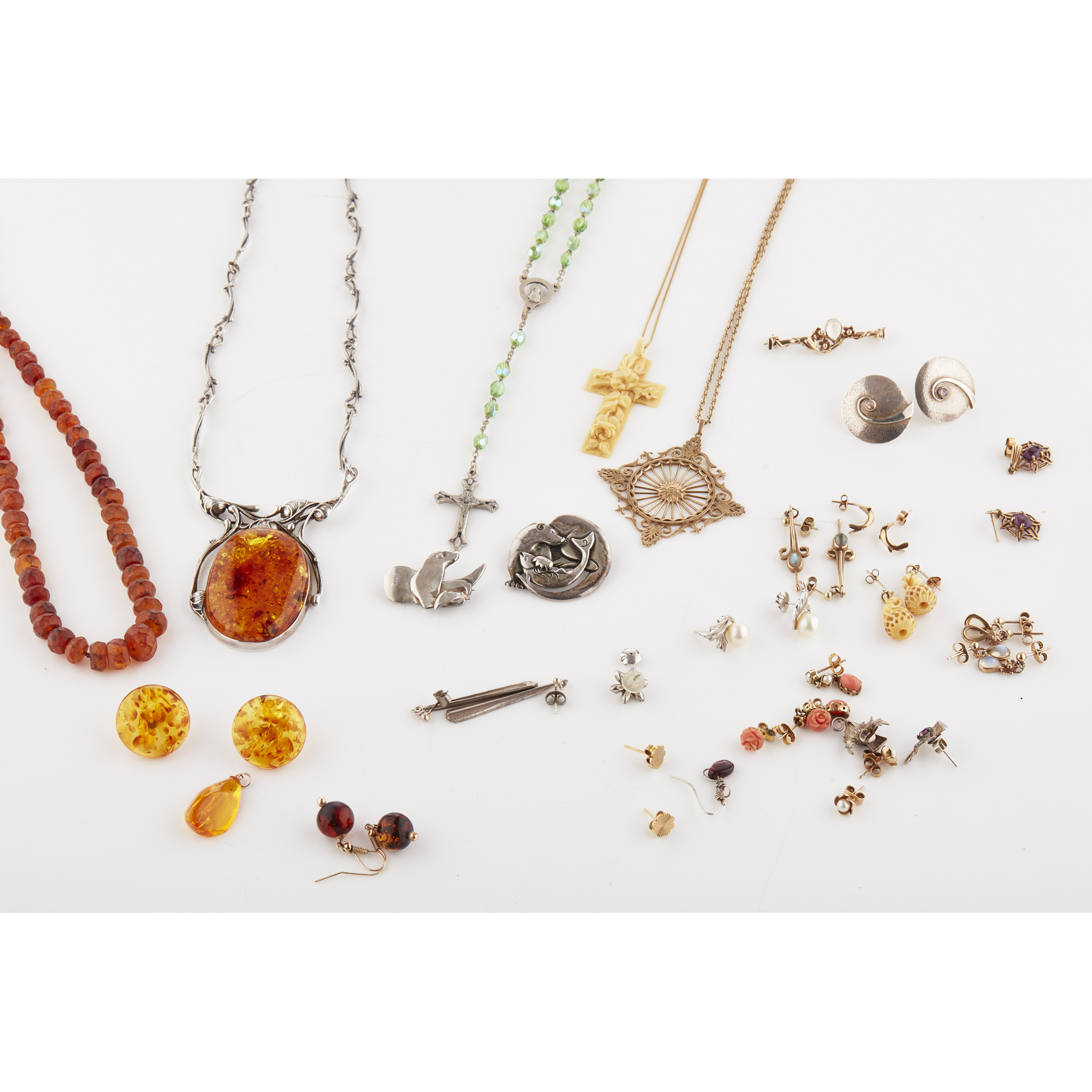 to include a large silver and amber pendant; various other amber necklaces; earrings and pendants; various pairs of gem set earrings, silver brooches, pendants (qty)