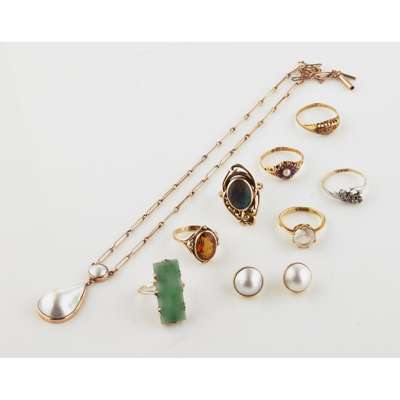 to include a yellow metal pearl set pendant with integral fetterlink chain and associated earrings; a jade plaque set ring, a 9ct gold and citrine set ring; a 18ct gold ruby and diamond ring and various other gem set rings (qty)