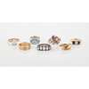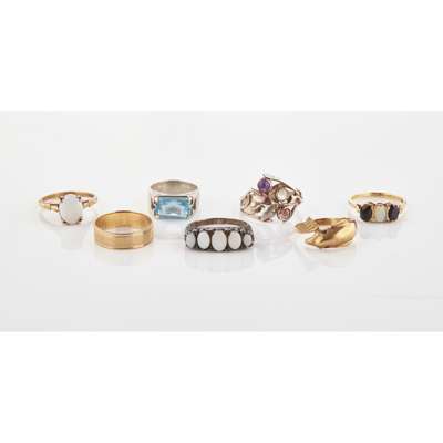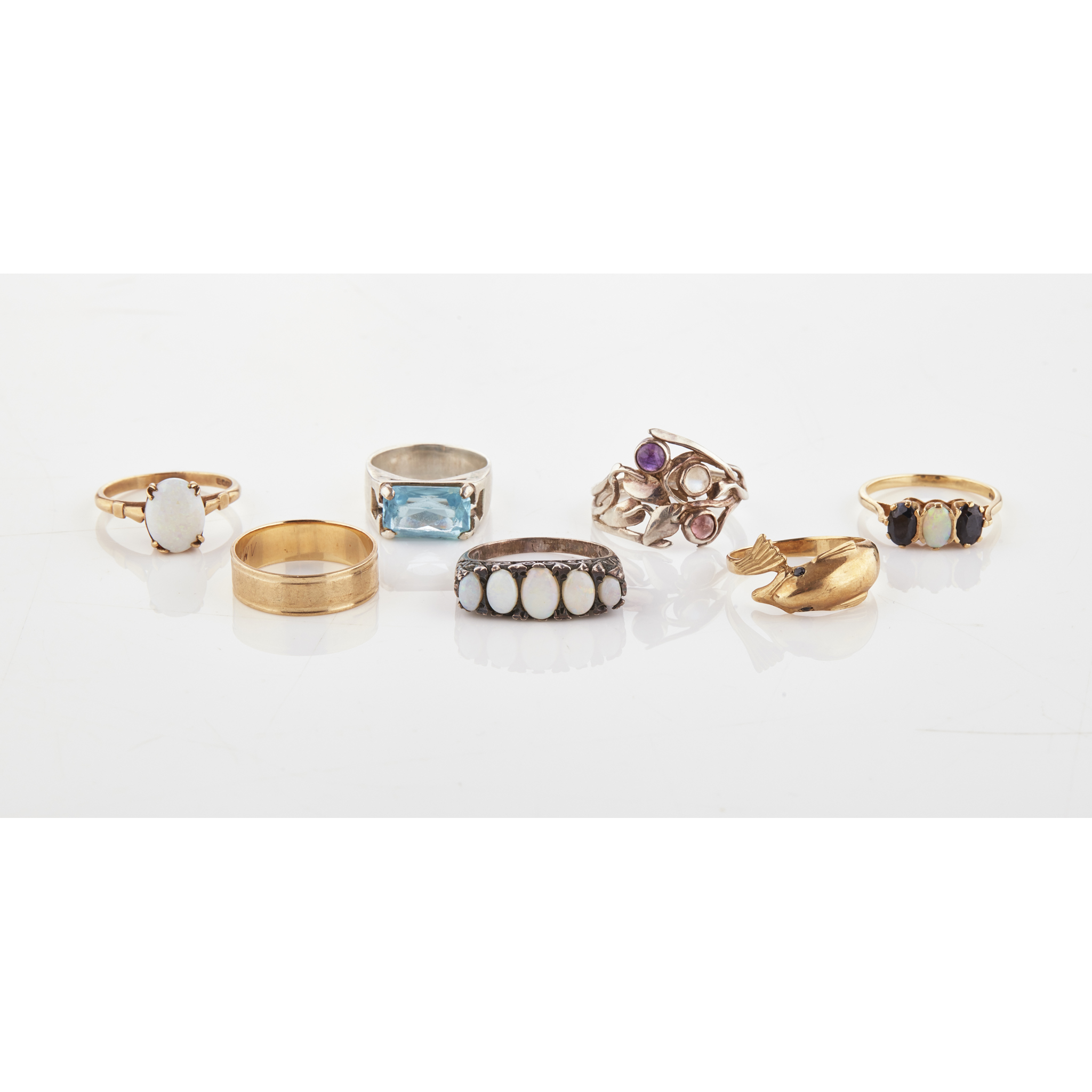 to include a silver mounted five stone opal set ring, a 9ct gold opal and sapphire set ring; a 9ct gold opal ring, a 9ct gold band and three other gem set rings (7)
