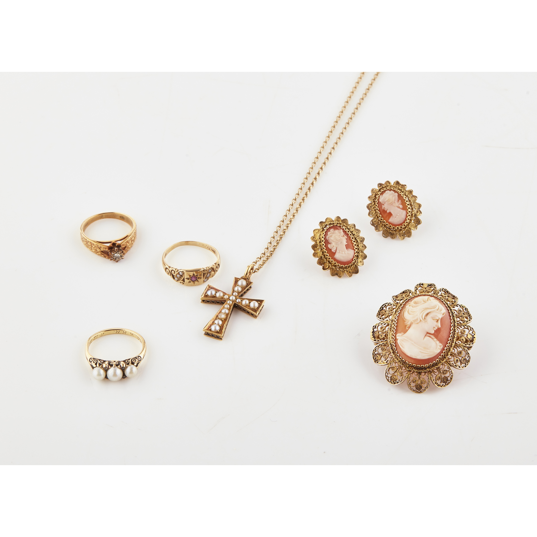 to include a half seed pearl set cross and chain, a three stone pearl ring; a cameo brooch mounted in yellow metal with filigree detail, together with matching earrings; a 9ct gold single stone diamond ring, a ruby and pearl set ring (6)