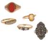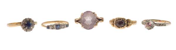 to include a yellow metal and garnet set ring; a sapphire and illusion set diamond cluster ring; a five stone sapphire and diamond ring; a single stone paste set ring; a pink quartz set dress ring, with additional gem set rings (qty)