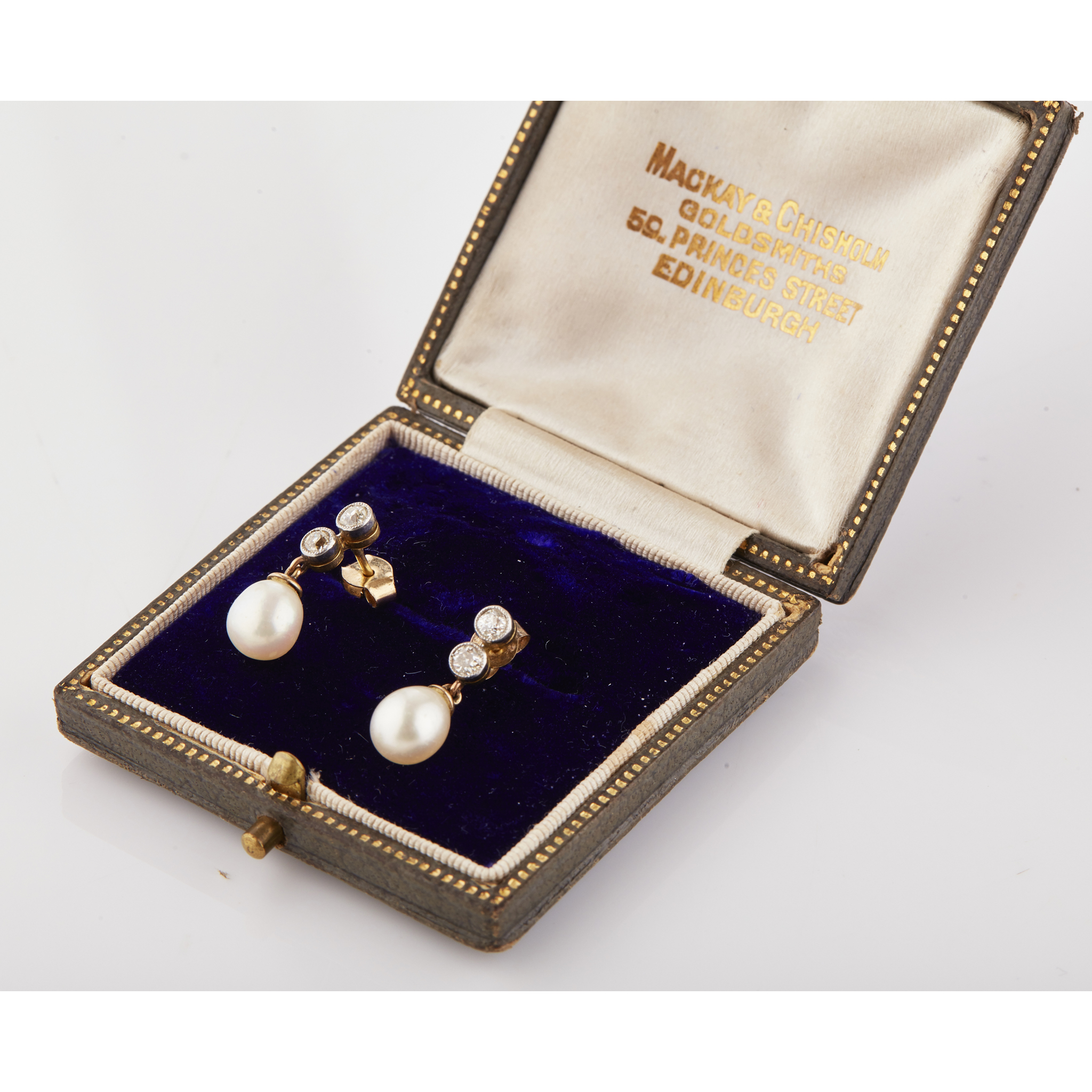 each millegrain set with two old cut diamonds, suspending a small drop shaped pearl, to post and butterfly fittings