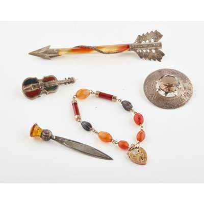 to include a smoky quartz set brooch with engraved detail; another modelled as a fiddle and set with hardstones; a citrine set bookmark with thistle terminal; an agate set bracelet with yellow metal padlock clasp; a large agate set kilt pin modelled as an arrow (5)