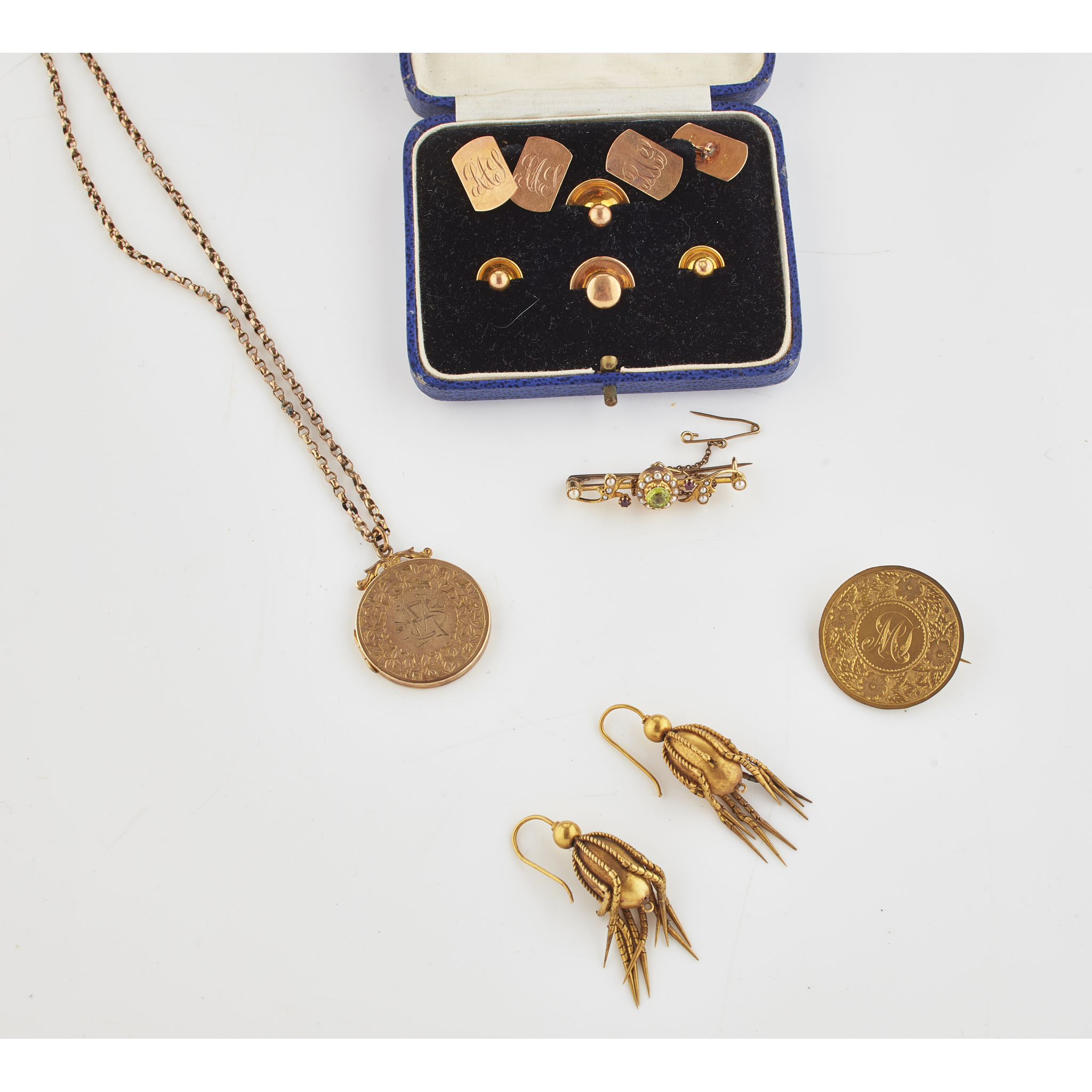 to include a 9ct gold gentleman's dress set comprising four studs and a pair of cufflinks, a pair of yellow metal pendant earrings with fringed design; a seed pearl, peridot and ruby set bar brooch; a 9ct gold locket and associated yellow metal chain; a yellow metal brooch (qty)