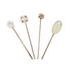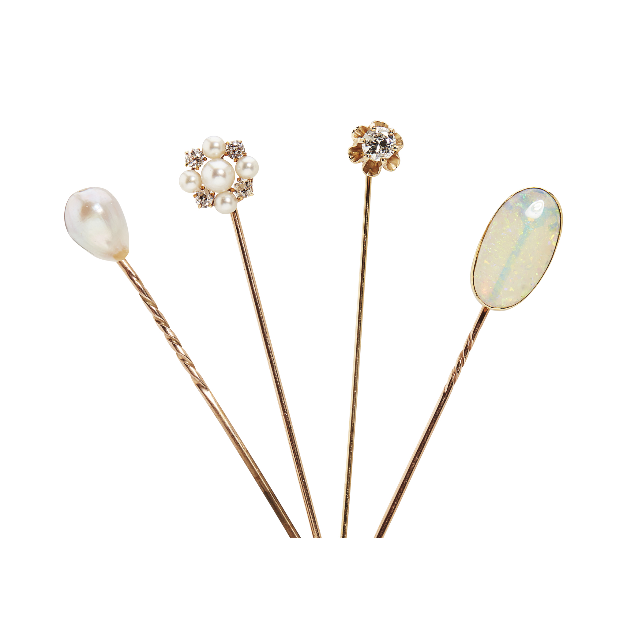 all modelled in yellow metal, to include one set with a baroque pearl terminal, another claw set with a small round cut diamond; one set with a pearl and diamond set cluster, another collet set with an oval opal (4)
