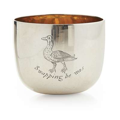 The tradition of the "All Souls Mallard" - At the beginning of each century, on or around January 14th, the warden leads a procession throughout the college to look for a mythical duck that appeared when the college was first being built, all the while singing the 'mallard song'. The mallard song, however, is not just sung once a century, but twice each year, at the November Gaudy and at the Bursar's Dinner in March, at the end and after singing the Mallard song the tradition is to celebrate the events and the tumbler cup offered here fits in with this. A number of items have been gifted to the college by Fellows and often the Mallard is a prominent motif, particularly on the silver.