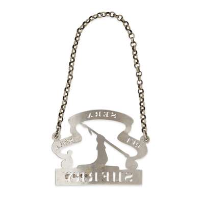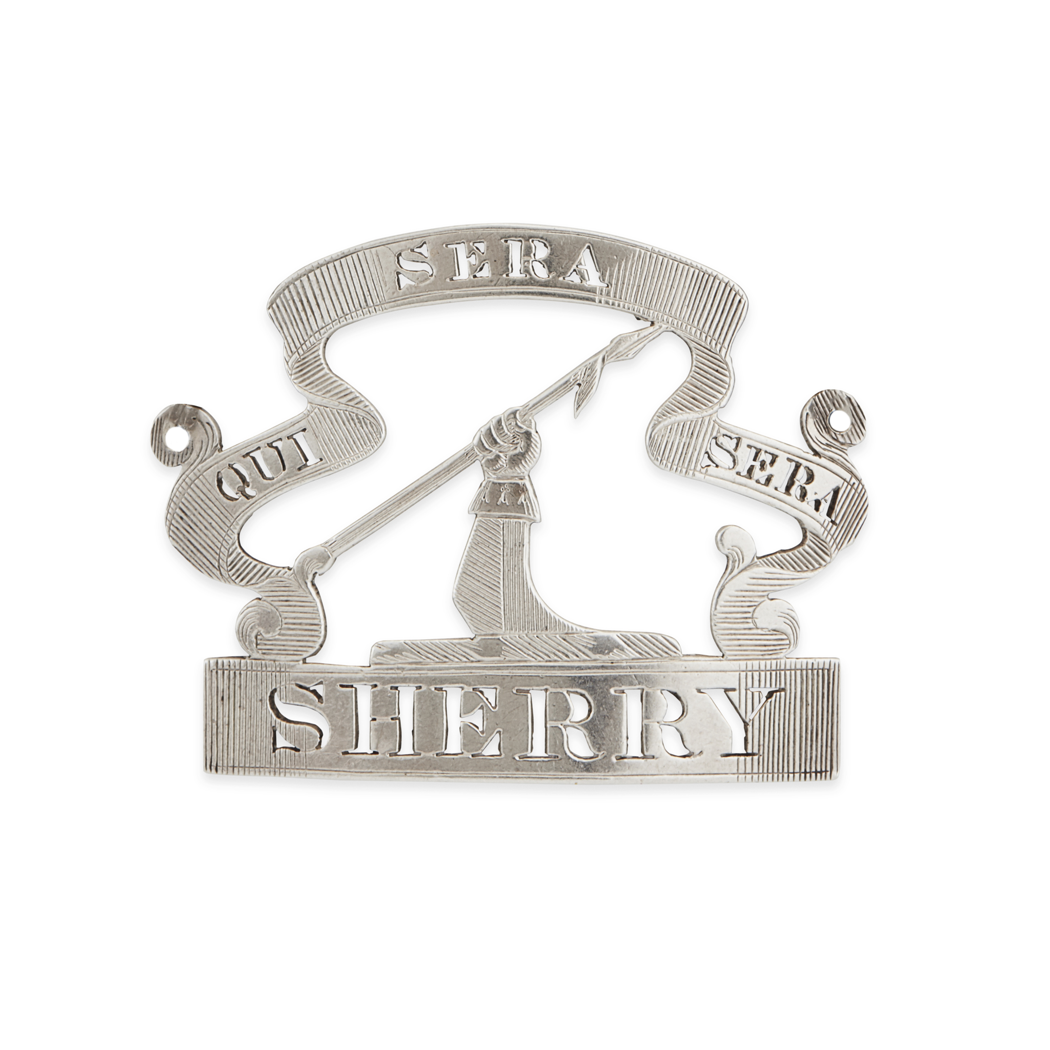 Rawlins and Sumner, London 1831, modelled as a pierced panel for Sherry, crest above and ribbon with engraved motto (What will be, will be)