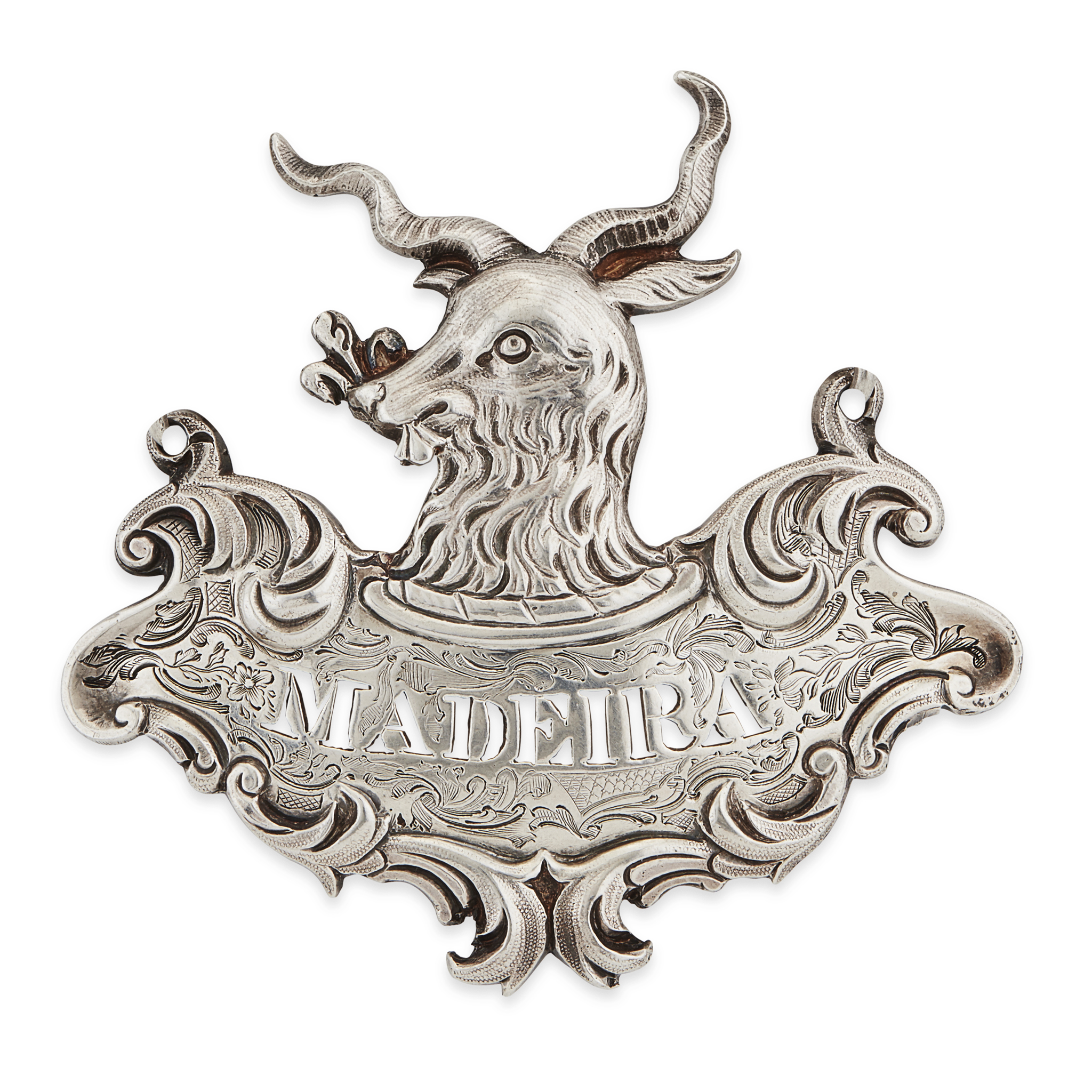 William Eley, London 1838, of curved form, engraved ground, pierced for Madeira, crest of a goat surmount, c-scroll border