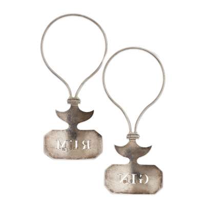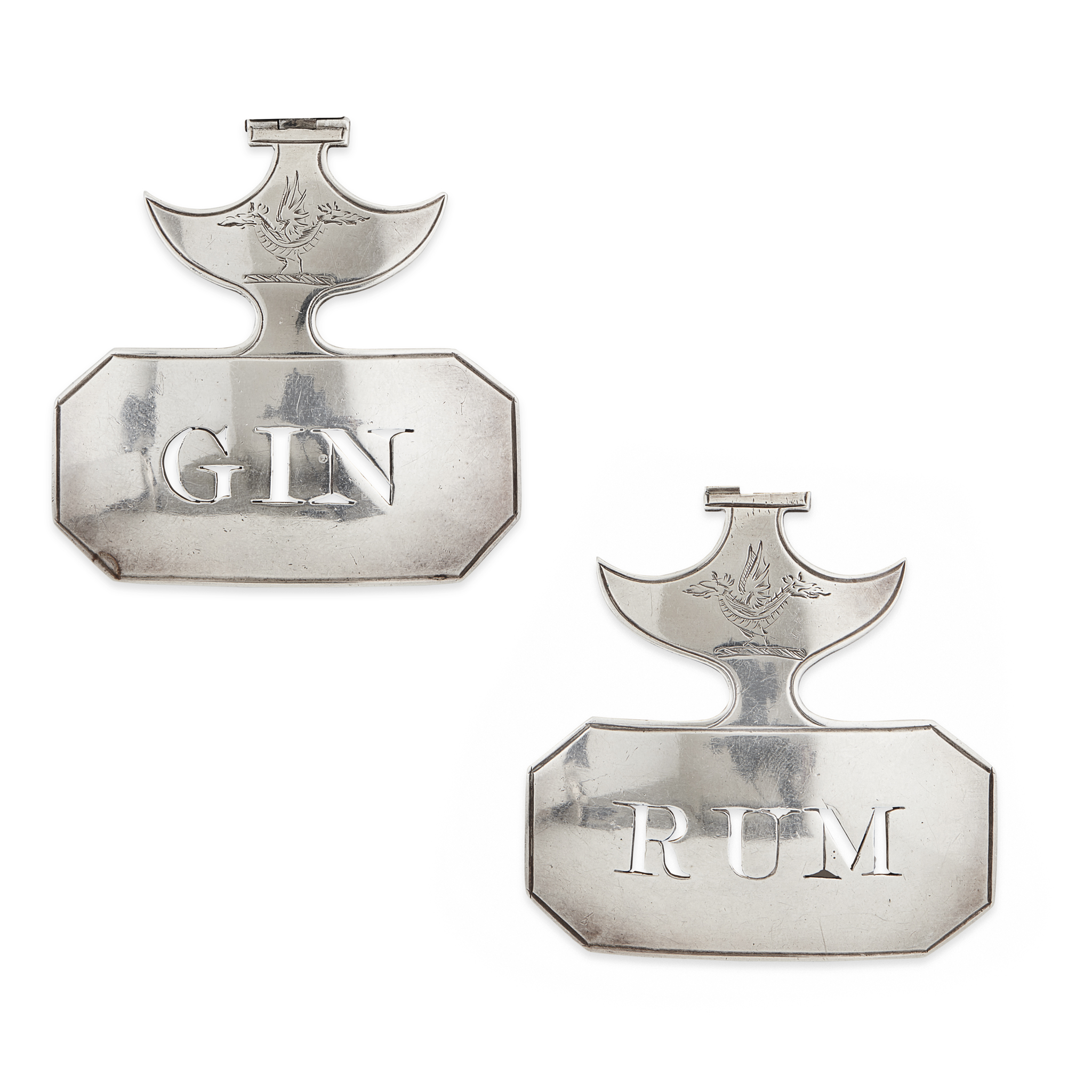Phipps and Robinson, London 1796, plain hoop rings, shaped urn engraved with crest, over a canted rectangular panel, each engraved Gin and Rum