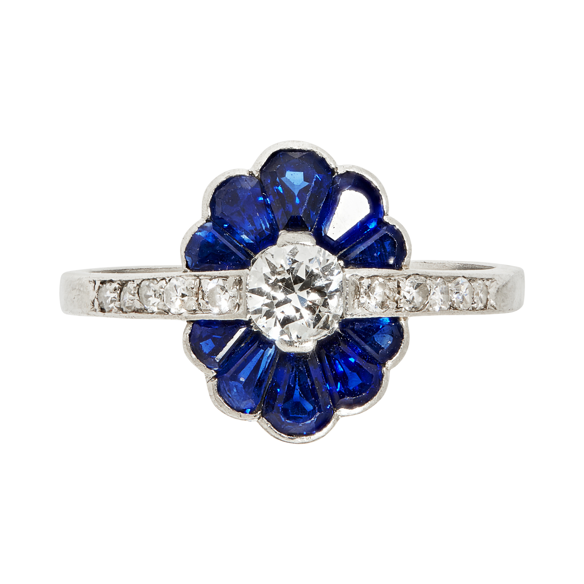 set with a old round cut diamond in a fanned border of calibre cut sapphires, the shoulders set with slightly graduated eight cut diamonds, to a plain white metal shank stamped PLAT