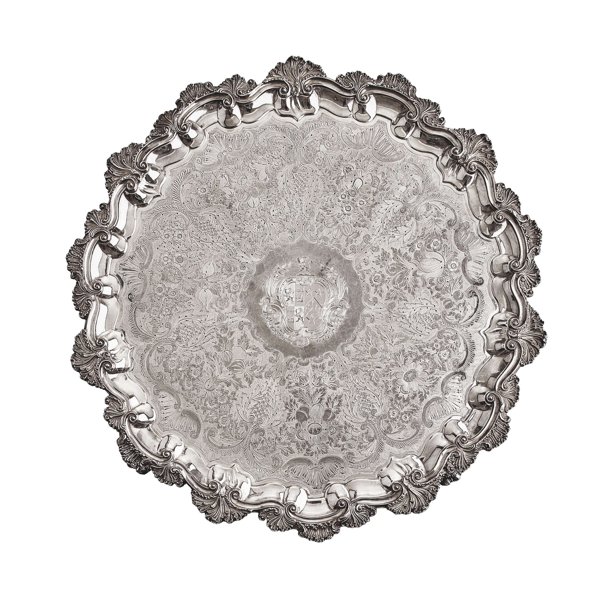 the bold rococco border of serpentine outline, moulded detail the flat engraved foliate scrolls, and central full set of armorials all raised on four shell and leaf clasped feet, in original wood case
