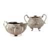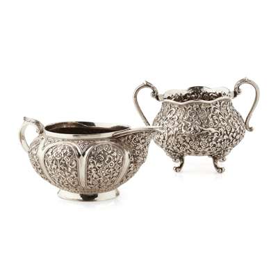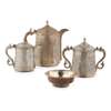 to include a small three piece coffee service; a covered box on stand, each with profuse foliate and scroll decoration; together with a sugar bowl and cream jug of baluster form with chased decoration raised on scroll supports, etc (qty)
