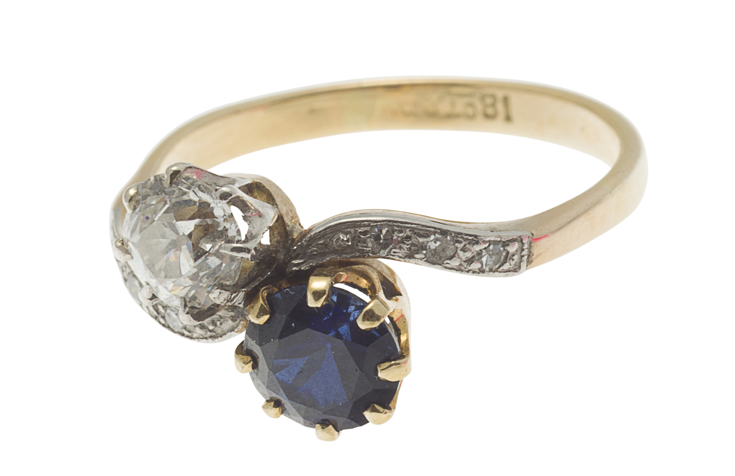 crossover design, set single circular cut synthetic sapphire and diamond, set in white and yellow metal, diamond set scrolling shoulders, the shank marked 18ct & Pt