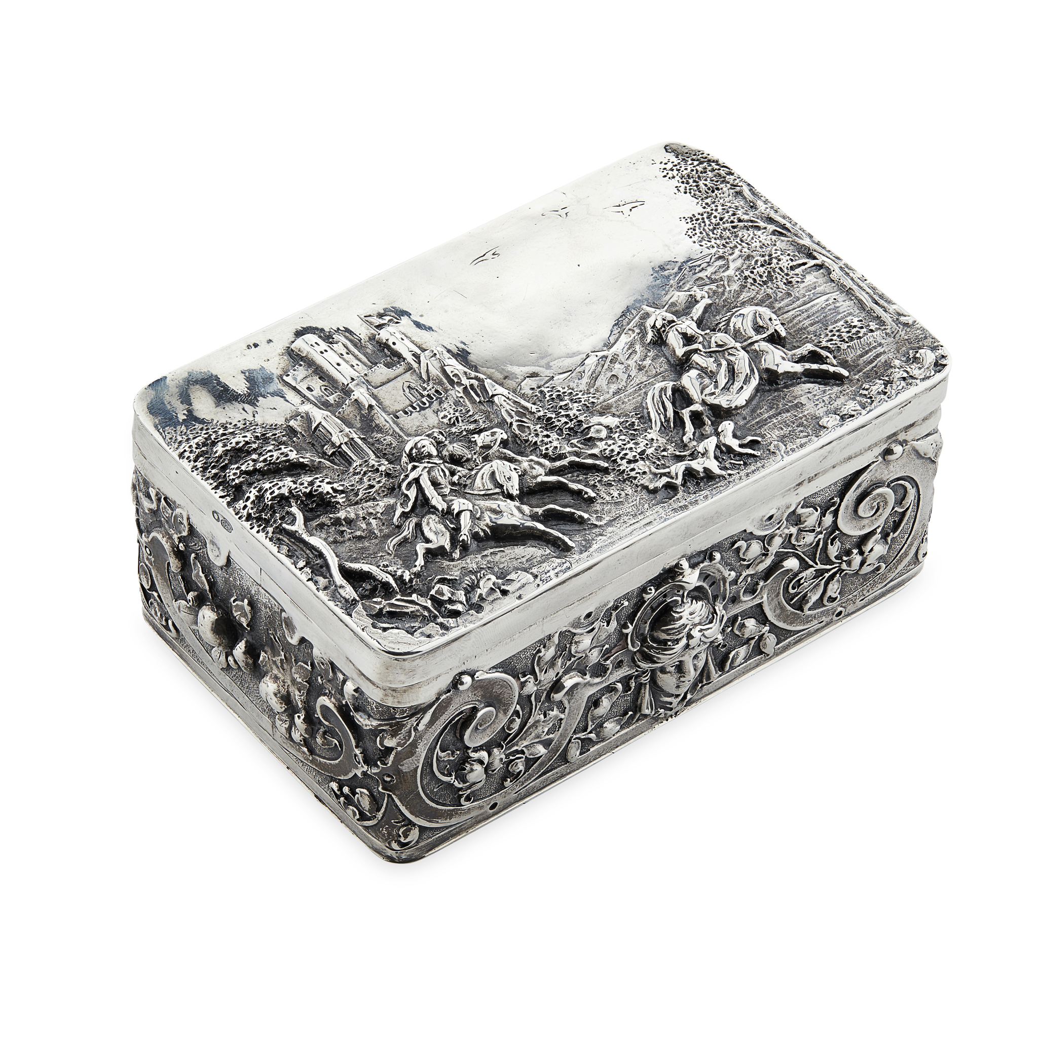 import marks for circa 1900, and bearing a pseudo 17th century mark for Wertheim, the rectangular hinged cover with decoration of figures on horse back with a castle to the rear, scroll and mask decorated sides