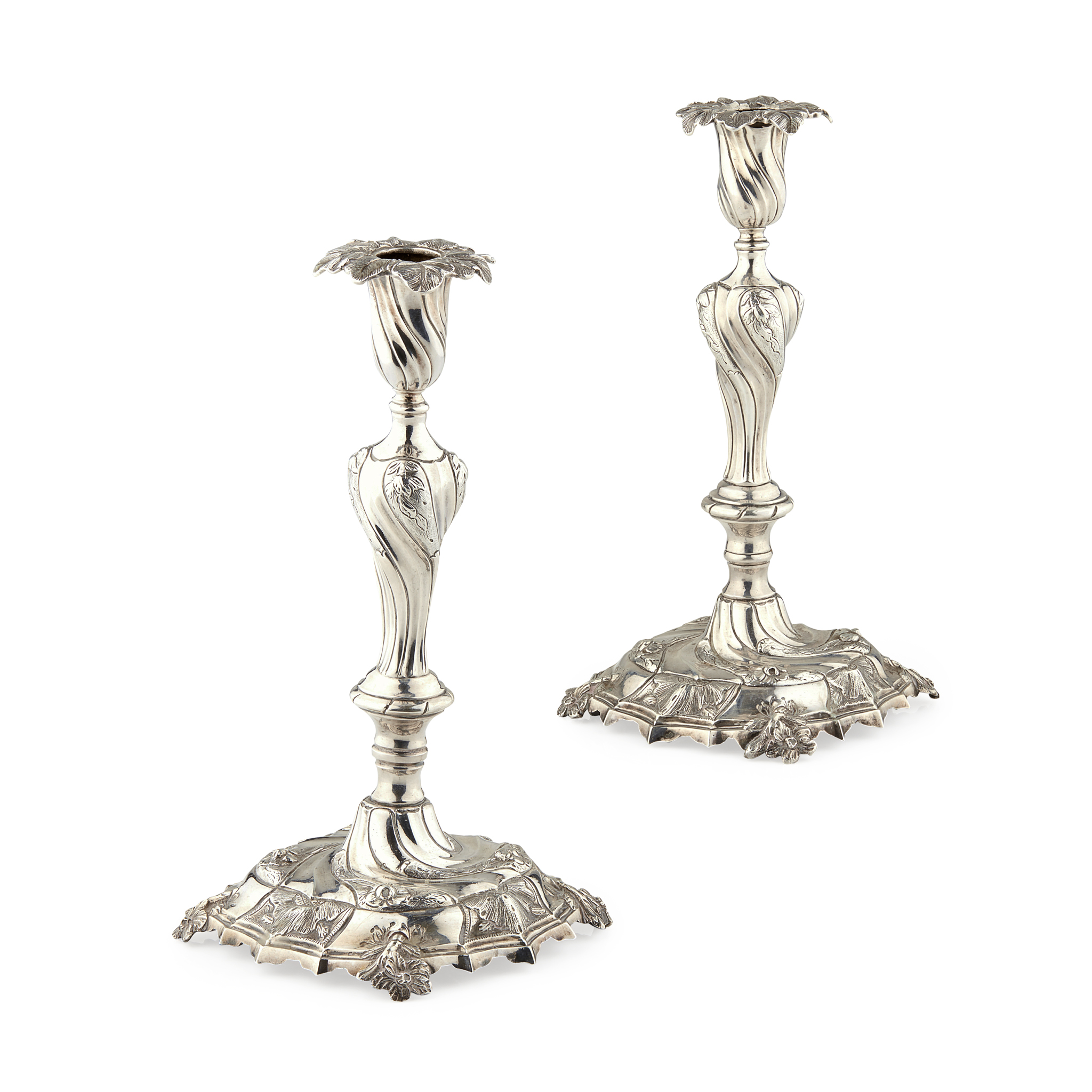 Amsterdam, mid eighteenth century, wrythen knopped stems with chased foliate details above a wrythen sconce and foliate drip pan, the spreading bases with floral detail