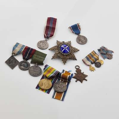 to include a mounted group of three, un-named, comprising 1897 Diamond Jubilee medal, 1902 Mayor's Coronation medal, Queen Victoria Volunteer Force Long service medal; a 1914 star awarded to C GARNETT B.R.C.S & O St J.J; a WW1 pair awarded to LIEUT JC DRYSDALE; various miniature medals and two unnamed coronation medals (qty)
