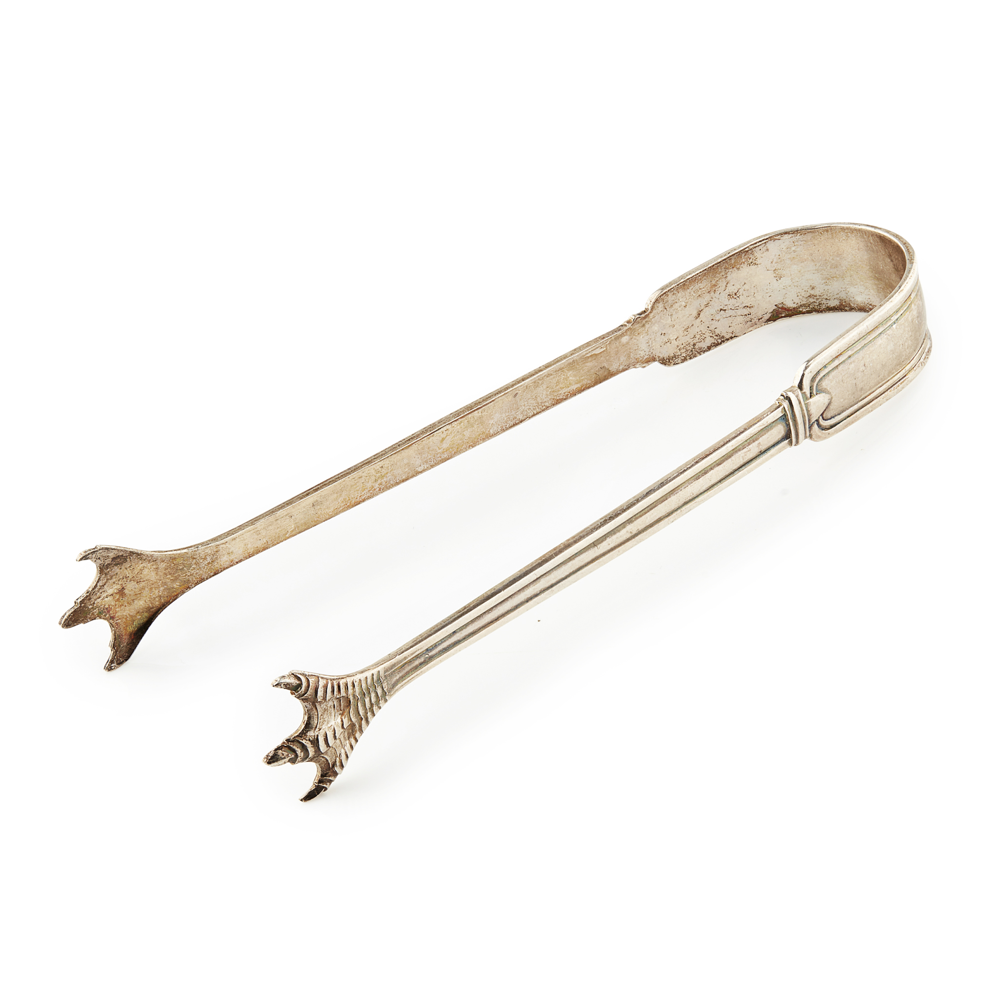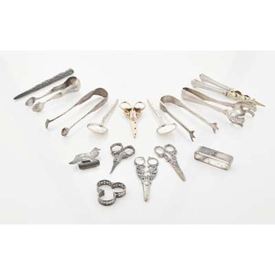 to include a pair of large sugar tongs by G Gordon of New York circa 1820, shaped fiddle pattern; a napkin holder in form of a collie; a pair of sugar tongs, moulded detail, claw grips; a further pair by Pogorzelski, shell grips; a pair of American servers by Bettridge of large form, planished finish; various pairs of sterling mounted scissors, spoons; napkin rings etc (qty)