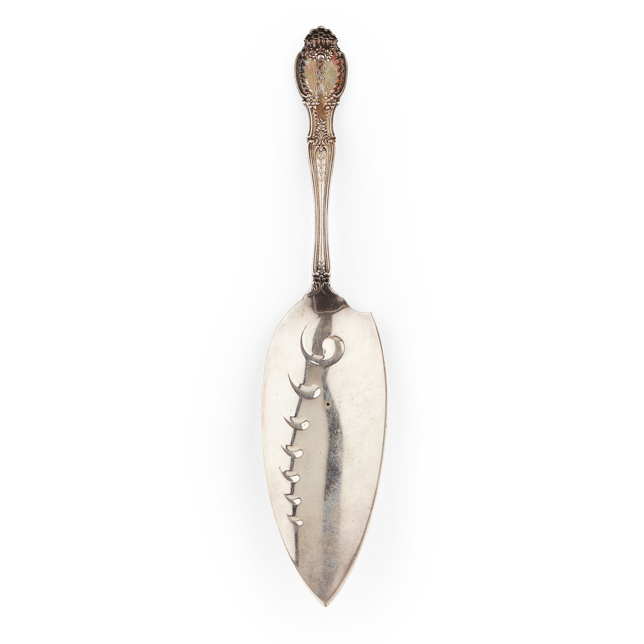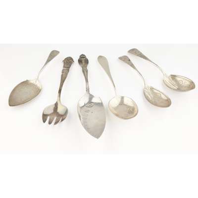to include a Tiffany serving knife with shaped blade and floral handle; a set of three engraved aesthetic movement pieces and two others (6)