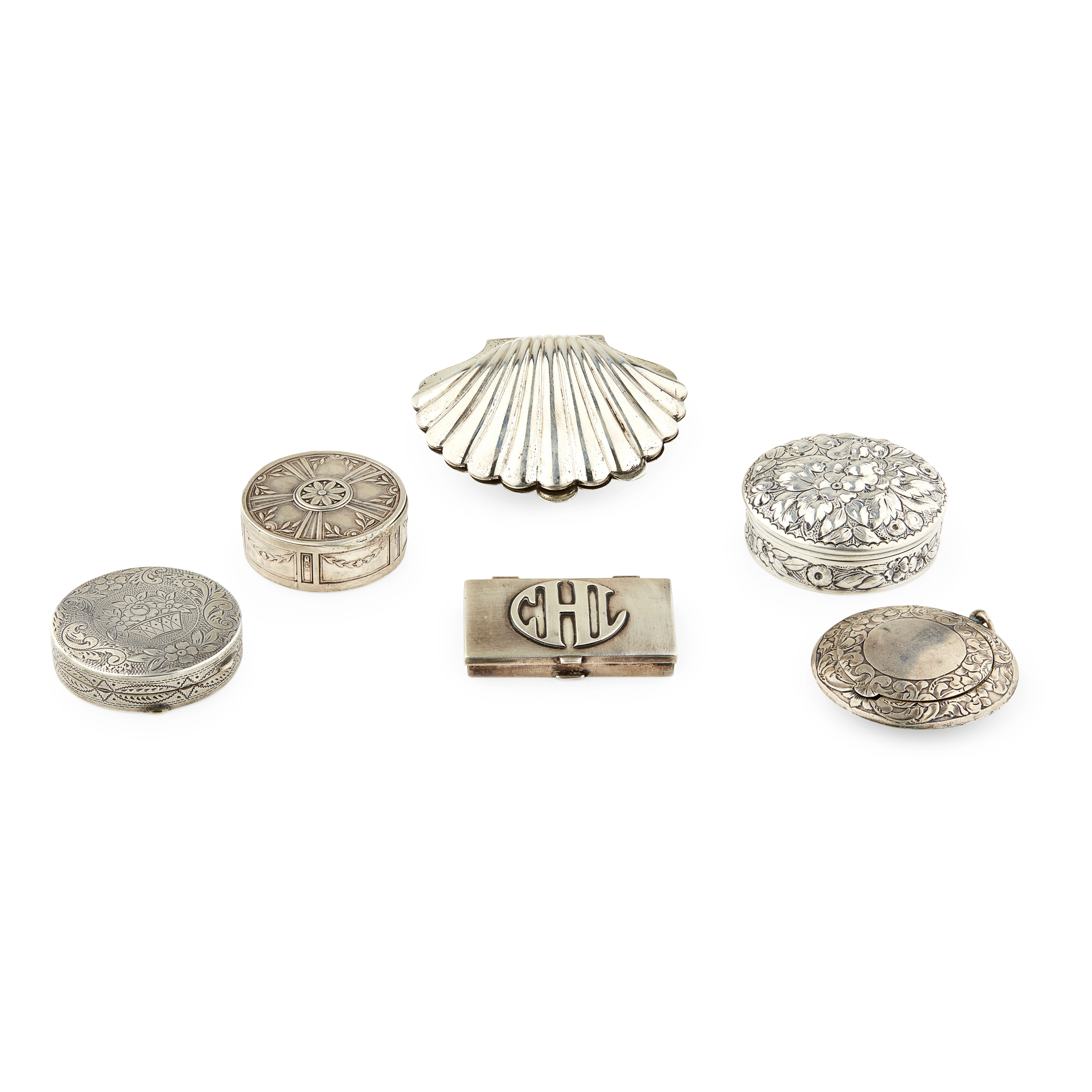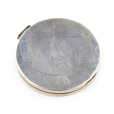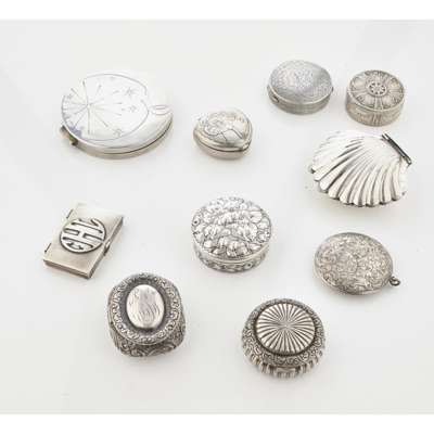 a modernist movement circular compact by Panzinger, simple engraved stars motif; three small early 20th century American patch boxes; a shell shaped compact by Napier; various other patch boxes mainly American (10)
