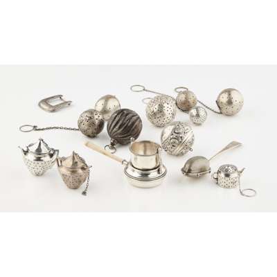 A collection of silver and other tea infusers