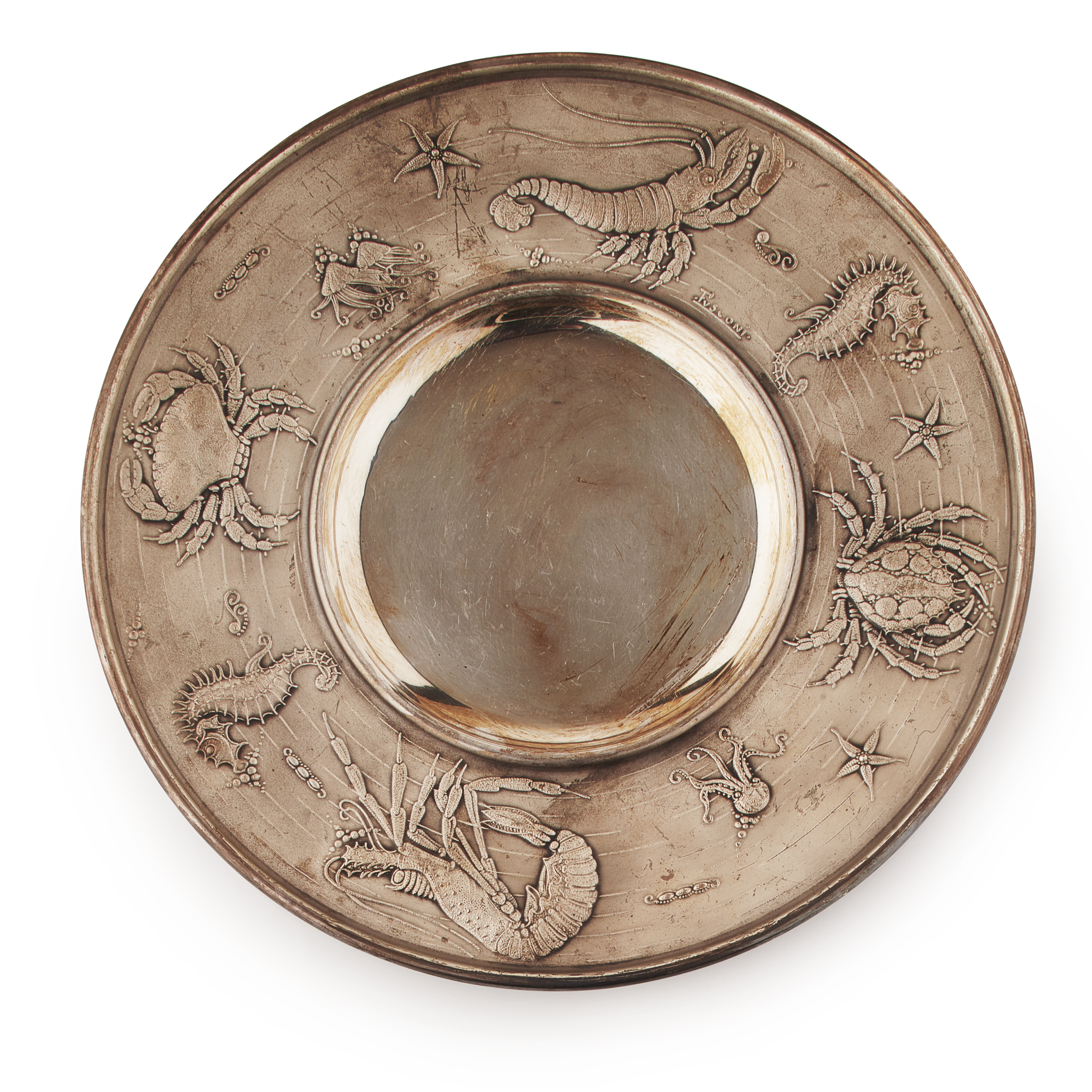 signed Tusconi, marked 800, of circular outline with wide border decorated with sea creatures, the centre plain