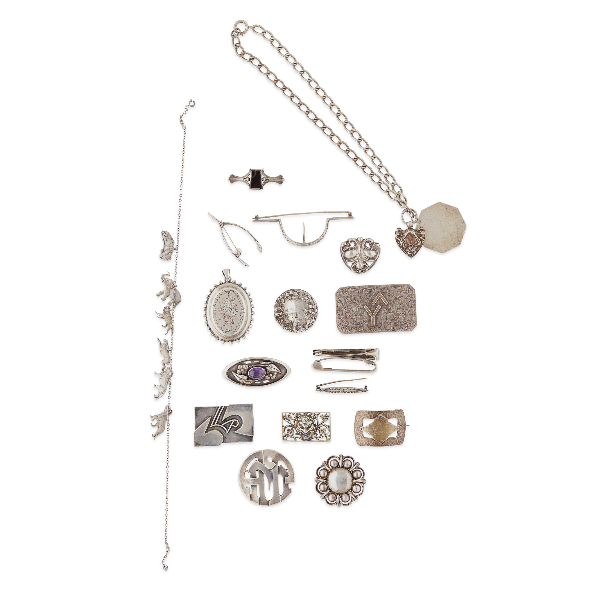 of various forms, various countries, to include; a silver and copper decorated Art Nouveau necklet; a sterling charm bracelet with wild animal charms; a stylised floral brooch by Kalo; a belt buckle by Otto F Ernst; an oval brooch of stylised design set amethyst cabochon by Kalo (qty)