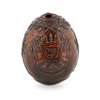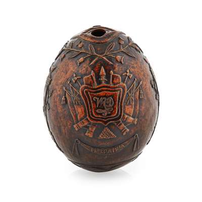 the coconut shell body carve with patriotic symbols, trophies of war and trailing foliate, with face carved to terminal