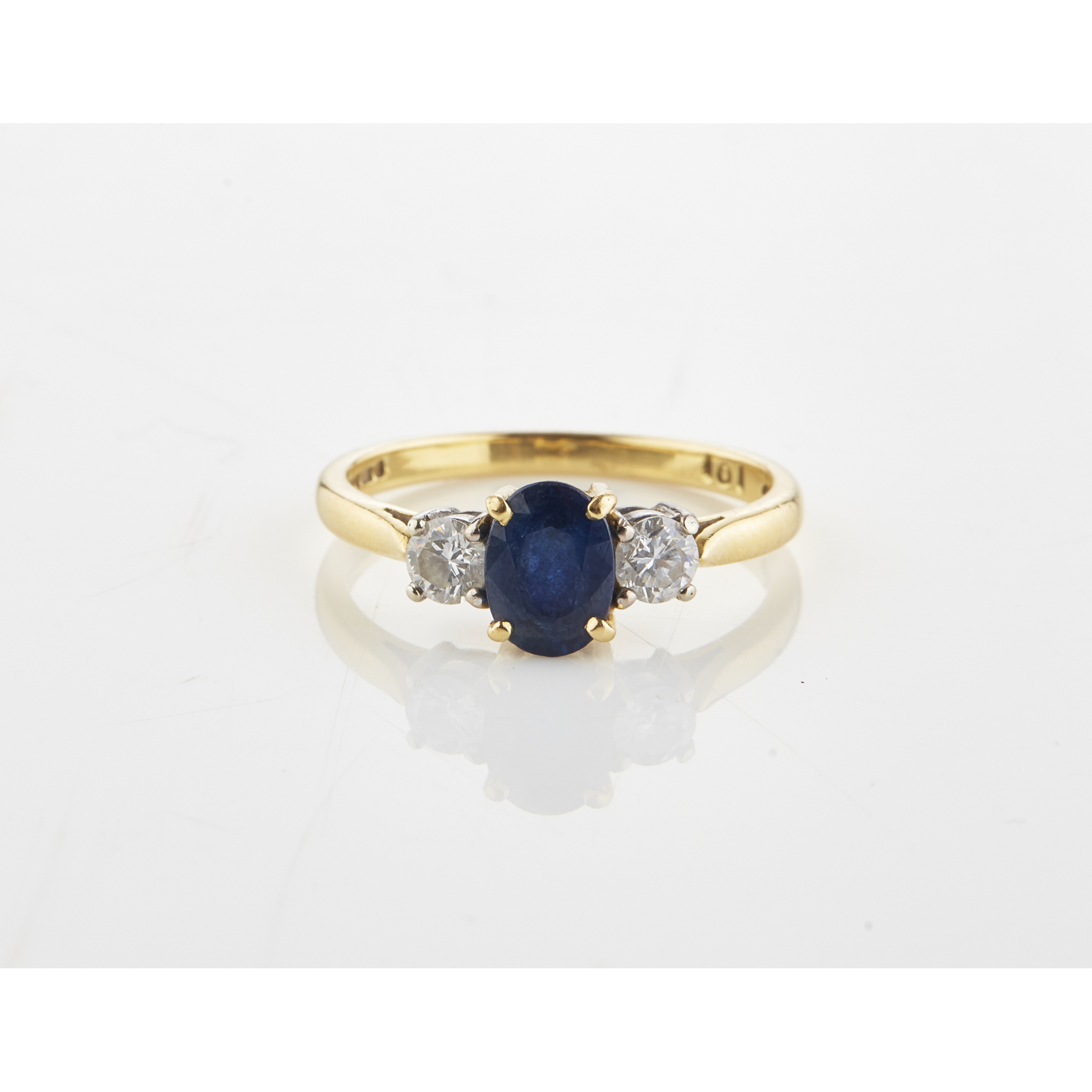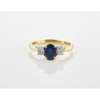 claw set with an oval cut sapphire flanked to either side by a small round cut diamond, to a plain 18ct gold shank