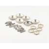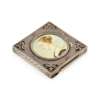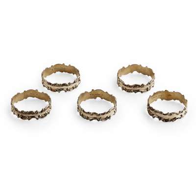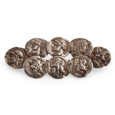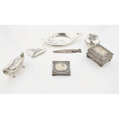 to include a sterling silver orchid dish, marked old Wallingford; a compact, unmarked of square form, inset miniature, engraved decoration; a rectangular dressing table box by W Kerr, bold stamped decoration; an Edwardian boat shaped small jewellery box of Art nouveau design; a small soap box; a Tiffany book mark of planished form; a small cigarello case, to include; five napkin rings, moulded scrolling rims; seven various brooches modelled on Roman Greek coins, some stamped; a group of six small pin trays, moulded rims, planished base, engraved panel (qty)