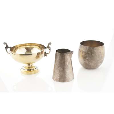 marked Tiffany Sterling, numbered 22583, of circular form, engraved initial and dated 1907-1957, scrolling cast handles and on pedestal foot; together with a bulbous sugar bowl and matching creamer both also by Tiffany (3)