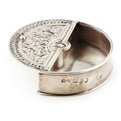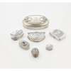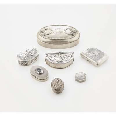 including a George III fan shaped snuff box, circa 1790, sliding demi lune chased figural cover, plain sides; a Dutch 19th century oval box, embossed hinged cover; another oval inset facetted oval quartz; a small purse, Russian, circa 1890, a large oval box and cover, Theodore Starr, engraved initials, laurel wreath decoration; two other small boxes (7)