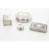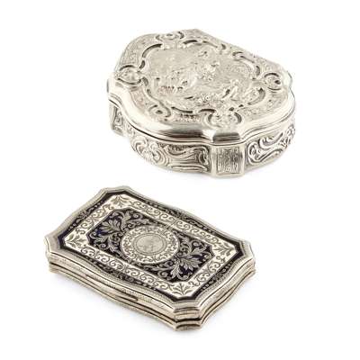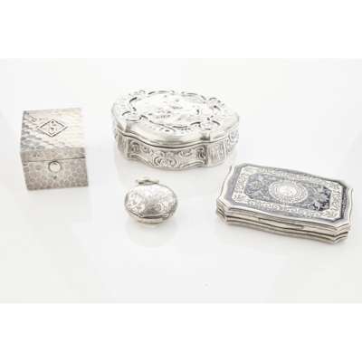 to include a sovereign holder of circular form; a serpentine outline box and cover, Dutch circa 1890, the hinged cover decorated with figures in a scrolling ground; a small rectangular box and cover with deep planished decoration, Mappin Bros, London 1900; a snuff box with enamel decoration to the hinged cover, stamped 800 (4)