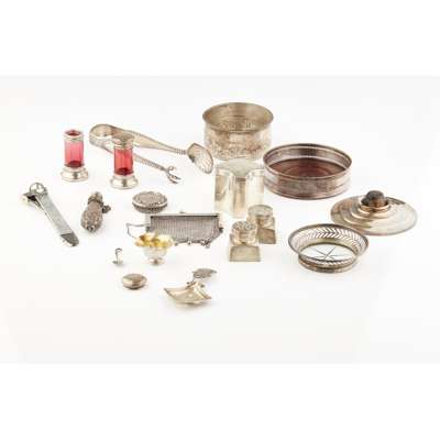 to include a child's bowl with scene of animals around base; a scent flask with all over foliate decoration; various condiment and chain link purses; together with a plated wine coaster and sundry items (qty)