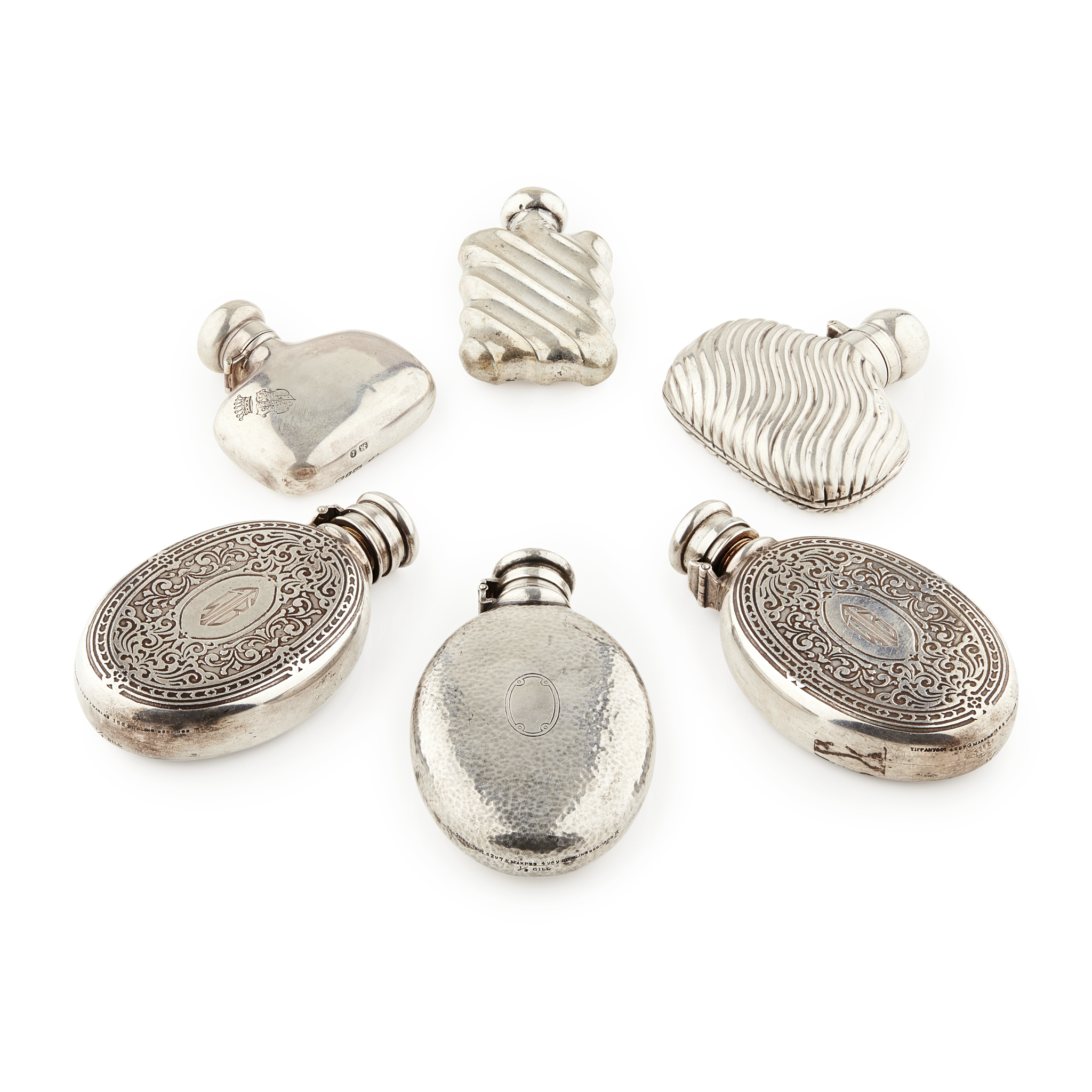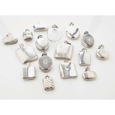 to include a pair by Tiffany, marked and numbered 4297 162, of oval form, deep formal engraved panels to the oval body, screw stopper; another also by Tiffany, oval planished form, numbered 4297 4969; various others, mainly GB, late 19th and early 20th century, small, some plain, some decorated, various designs and shapes and one with a moulded glass body silver lid (15)