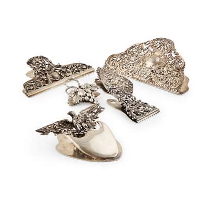 marked Sterling, each of sprung hinged form with pierced and embossed decoration, one formed as a bunch of grapes and another with displayed eagle above a vacant shield (6)