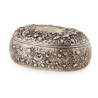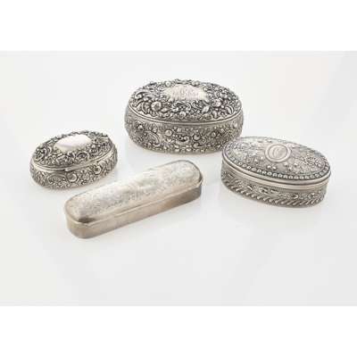 all marked Sterling, to include a matched pair of oval examples, one fitted as a jewellery box; another oval similar example with engraved initial C to cover and a long rectangular example with engraved decoration (4)